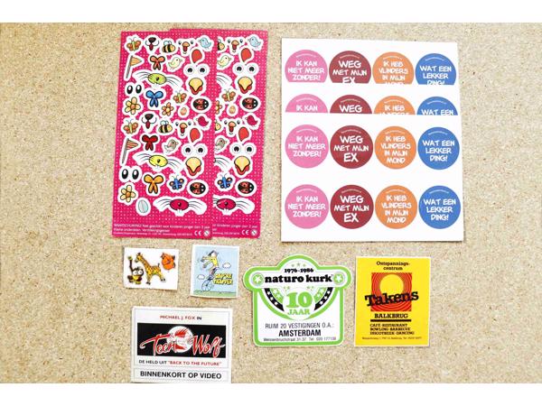 Stickervel met tekst 3 stuks (buttons) en stickervel 2 stuks voor de Pasen om paasei mee te versieren, sticker met bewegende oogjes d.m.v. platsic bolletje met soort kraaltje erin, en reclame stickers etc
