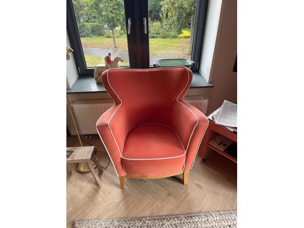 Stoel oranje. Piping op rechterarmleuning beetje kapot (2cm)