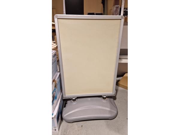 Groot stoepbord met vast onderstel, is makkelijk te verplaatsen door de wielen. De afmeting van het promotiemateriaal is maximaal 125 cm hoog bij 90 cm breed. Staat momenteel in de weg in het magazijn.