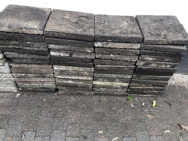 Ca 30m2 stoeptegels. Grotendeels gebruikt als borderrand, deels onder de grond. Vooral grijze tegels. Sommige zijn rood.