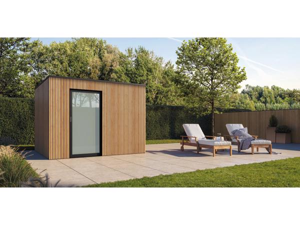Strak tuinhuis Box-Thermo Wood in diverse standaard maten