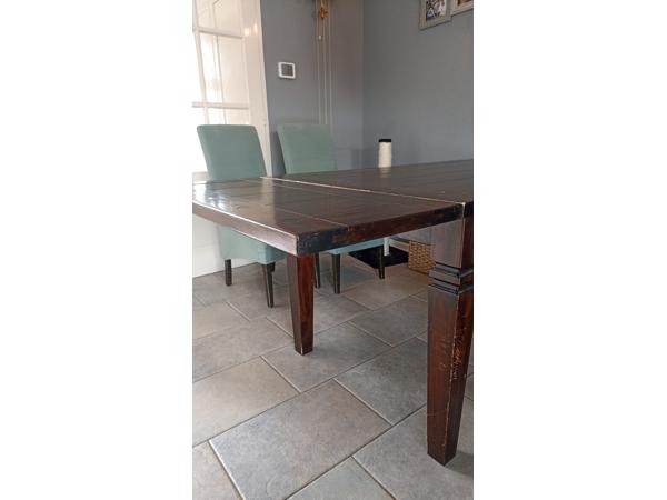 Deze tafel is ideaal voor grote groepen en gezinnen. Standaard maat 160x90. Met twee aanzet bladen tot 240cm te verlengen. De 4 stoelen hebben een extra hoes. Oorspronkelijk Bordeaux rood, maar vanwege een interieur aanpassing voorzien van een groene hoes