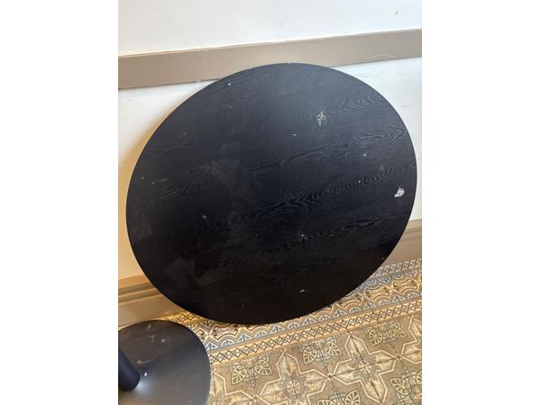 • Ronde tafel (zwart) • Ik vind de tafel nog mooi, maar ik heb er helaas geen ruimte voor • Het blad zou ik licht schuren en opnieuw lakken; verder is de tafel in goede staat • Wordt geleverd exclusief bouten • De diameter is naar schatting ongeveer 1 meter • Dit kan ik nog exact nameten indien gewenst