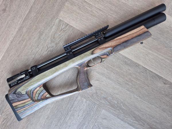 Deze pcp is gereguleerd en schiet dus zeer constant en accuraat door de CZ loop. De Taipan Veteran staat bekend om zijn zeer fijne trekker die op maar liefst 7 punten is af te stellen. Hij is afgesteld op 40 joule en is prima zonder extra demper te schieten, want de loop is al gedempt. Kwalitatief is deze buks vergelijkbaar met een Kalibrgun Cricket maar dan technisch beter. Maximale vuldruk is 250 bar en de regulator staat op 100 bar afgesteld.