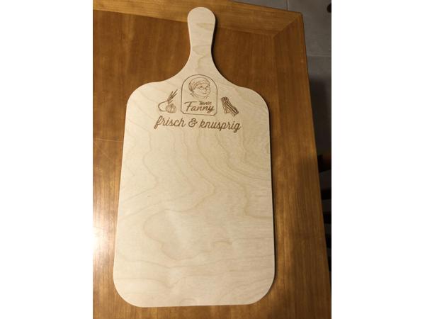 Nieuwe serveerplank of borrelplank met tekst Tante Fanny Frisch & knusprig.