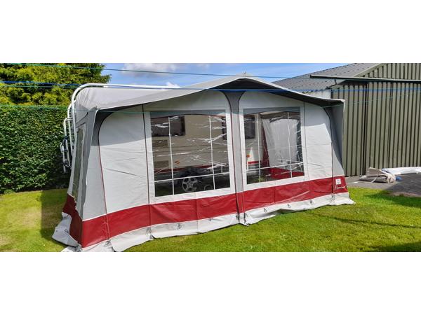 Nette Walker Prominent Voortent. De tent is 2.40 diep. Tentstokken zijn aan de caravan te bevestigen met clips (zie foto). Omloop maat is 882, dit komt overeen met omloopmaat 10 van Dorema. De tent heeft stokken van staal.Evt. met luifel te koop voor €100,00 extra ( staat niet op de foto maar is hier te bekijken). Het luifel heeft stokken van aluminium.