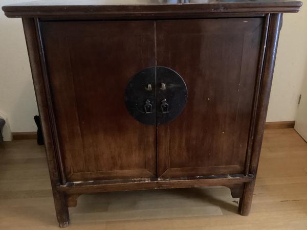 Teak houten tv kast met 2 deuren. Breedte, 105 cm, hoogte 104 cm, diepte 65 cm. De tv staat op een planken verhoging in de kast zodat daaronder ruimte is voor een decoder.