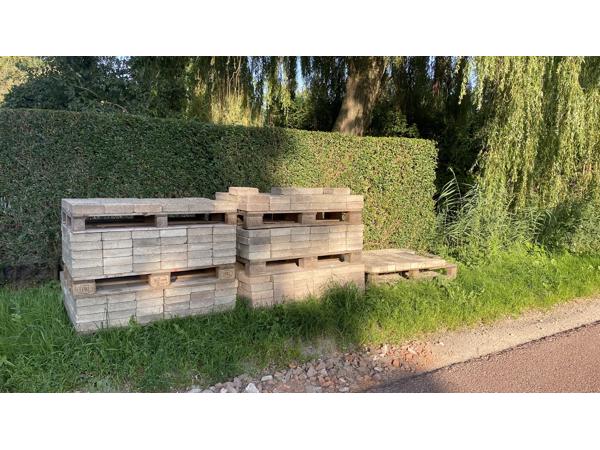 De pasblokken zijn gestapeld op Europallets. Mijn overbuurjongen kan de hele partij voor een kleine vergoeding voor je op een aanhanger zetten.