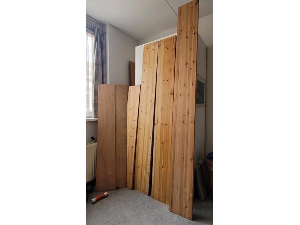 4 Grenen JéWé timmerpanelen, dikte 2,7 cm, breedte 24,5 cm, lengte 144,5 cm, 235 cm en 2 van 200 cm. Er ziten wel schroefgaatjes in en op de langste staan potlood markeringen. Tevens 2 stukjes multiplex.