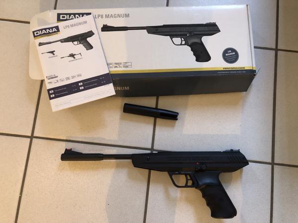 TK Diana LP8 Magnum project. 4.5mm. Hij schiet goed, is zuiver en functioneert goed maar komt te ver links af. Vandaar 'project'. Bouwjr 2020, incl doos en spanhulp en boekje. In zeer mooie staat. Amper tot geen gebruikssporen. Zelfs de rail oogt nog nieuw.