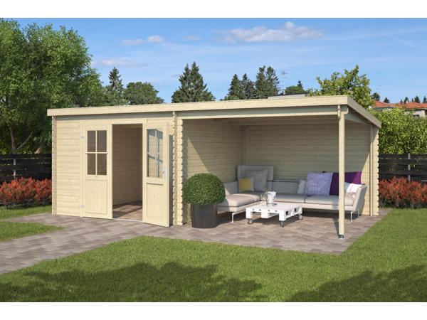 Nieuw goedkoop modern tuinhuis met overkapping te koop.