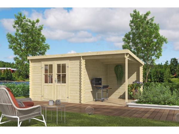 Nieuw goedkoop tuinhuis met lessenaarsdak 28mm blokhutprofiel te koop.