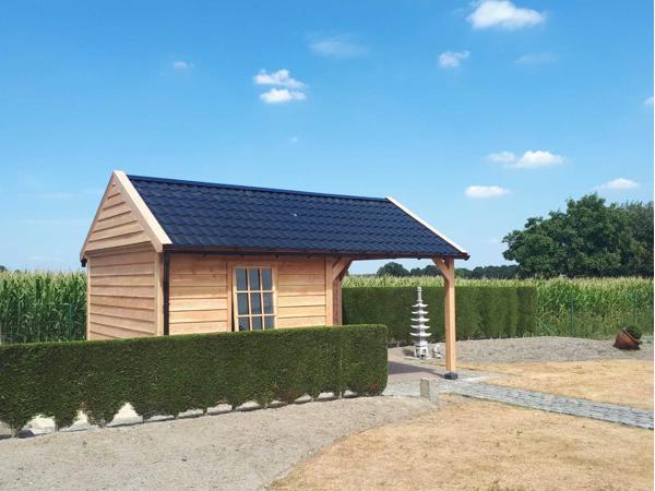 Douglas tuinhuis met zadeldak en overkapping te koop.