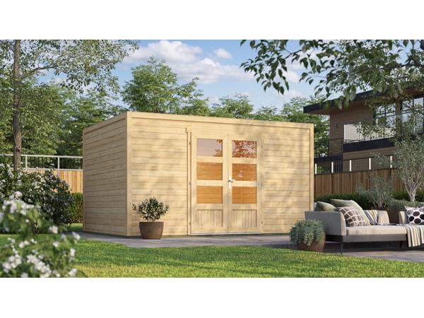 Het tuinhuis Quby 400x300 heeft een fundamentmaat van 400cm(b) x 300cm(d). De massieve 28mm dikke vurenhouten wanddelen zijn uitgevoerd met veer en groef. De stapelbouw methode in combinatie met hoekpalen en schroefsysteem zorgt voor een zeer sterke constructie. Dit modern en strak vomgegeven tuinhuis met haar dubbele dichte deur is onder andere geschikt als hobby of werkruimte maar ook als berging voor uw tuinspullen. Het vele glas in de extra hoge deuren zorgt voor een fraaie lichtinval. Het basispakket wordt geleverd inclusief een duidelijk montagehandleiding, onderdelenlijst en uiteraard alle benodigde bevestigingsmaterialen zoals het deurbeslag. Dit tuinhuis wordt zonder dakbedekking geleverd, hiervoor kunt u gelijktijdig het duurzaam en hoogwaardig Outdoor Life Products EPDM dakpakket bestellen. Het stapelbouw blokhut systeem is door de handige doe-het-zelver prima zelf te monteren en dit tuinhuis wordt als bouwpakket bij u thuis geleverd.