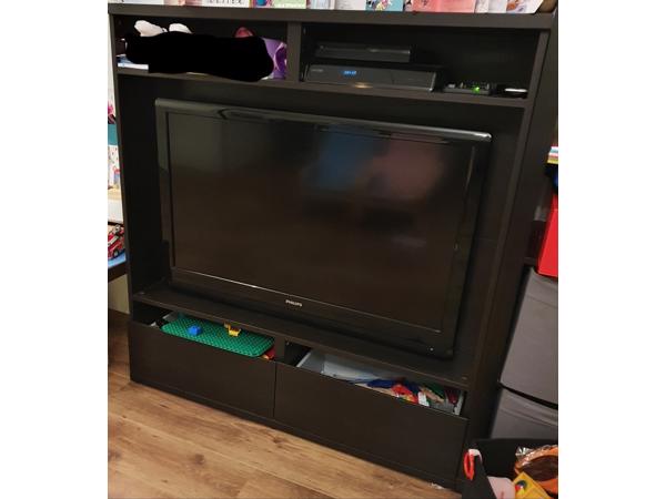 Tv meubel Ikea Zwartbruin 2 lades, wij hebben de glas platen (glanskleur) eruit gehaald die er op horen maar zijn wel aanwezig 2 vakjes boven de tv Normale gebruikerssporen