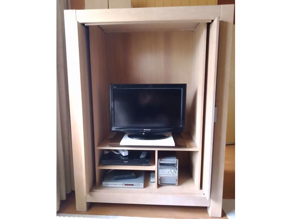 TV-kast van eiken, wit geolied. Hoogte 1,60 Breedte 1,20 Diepte 0,60 Heeft een bruin metalen draaibaar plateau van 0,65x0,35 om de tv op te plaatsen en gaten aan de achterkant voor alle bedrading. De kastdeuren schuif je na openen makkelijk de kast in. Geen beschadigingen!