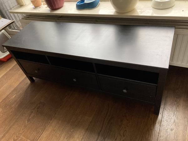 Zwart IKEA tv meubel van de hemnes serie. Blank hout aan de binnenkant van de lades met een gestreepte bodem.