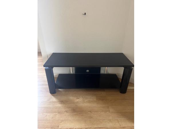 Televisiemeubel in zwart, lak afwerking en chromen details. Afmetingen: 120 cm breed, 45 cm diep en 51 cm hoog. Is een setje met de console die ik ook aanbied.