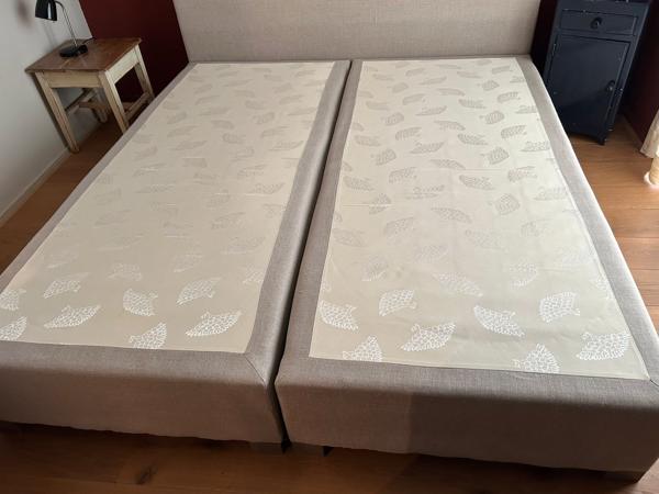 Mooie tweepersoons boxspring met hoofdbord in een neutrale beige kleur