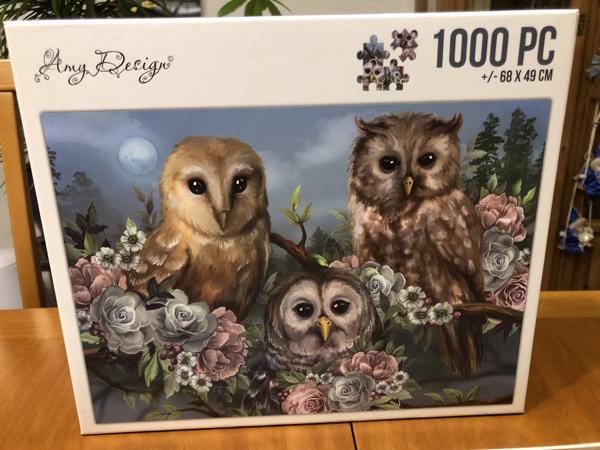 Uilenpuzzel van 1000 stukjes met hierop 3 uilen in zachte kleuren.
