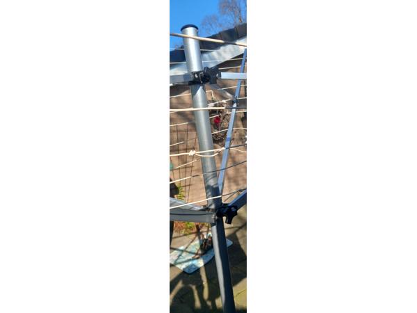 Roest vrije droogmolen. Boven en onder te spannen met draaiknoppen. Is altijd binnen opgeborgen. Standaardpijpje met afdekknop nog uit de grond te halen.