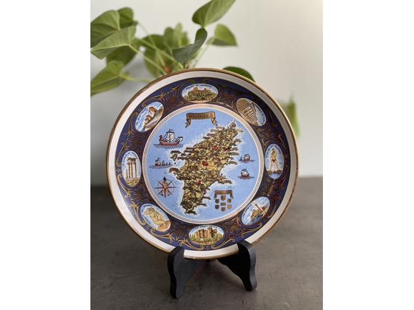 Vintage decorative earthenware plate from Rhodes, Greece. Handmade. Gilded with 24-karat gold. Period: between 1960 and 1990. With stamp: ADIS HAND MADE IN GREECE 24K GOLD. Diametre: 24 cm. For delivery, check our Vinted page: surprisewinkel