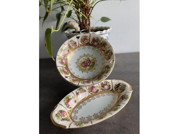 Vintage porseleinen bord en schaal. Bord komt met een stempel. Diameter bord: 19 cm. Afmetingen schaal: 12,5 cm x 22,5 cm. Voor verzending, kijk op onze Vinted-pagina: surprisewinkel