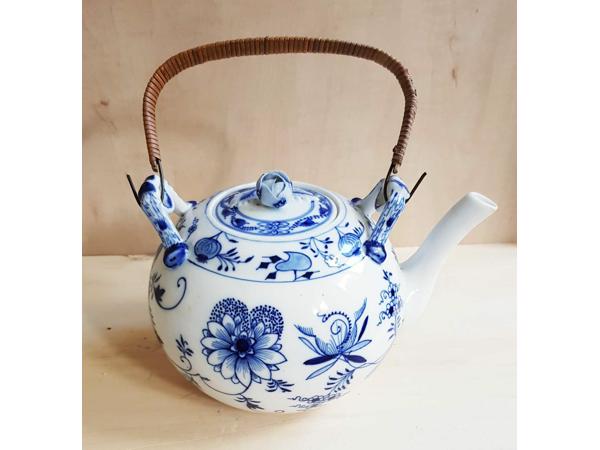 Vintage uienpatroon keramische theepot, blauw en wit keramiek, handgeschilderde theepot met rieten handvat.