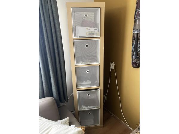 Een wandmeubel kast met opbergmandjes van grenen hout