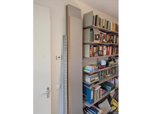 📷 6 stalen wandrails van 200 cm., 4 MDF planken van 250 cm. en 3 van 230 cm. Alle planken zijn 30 cm. breed en hebben een zilvergrijze coating. Bijpassende plankdragers en boekensteunen. Ideaal als opbergsysteem voor boeken enz. Voor niets afhalen. Door de lengte van de planken is wel een bestelauto of bakkie nodig.