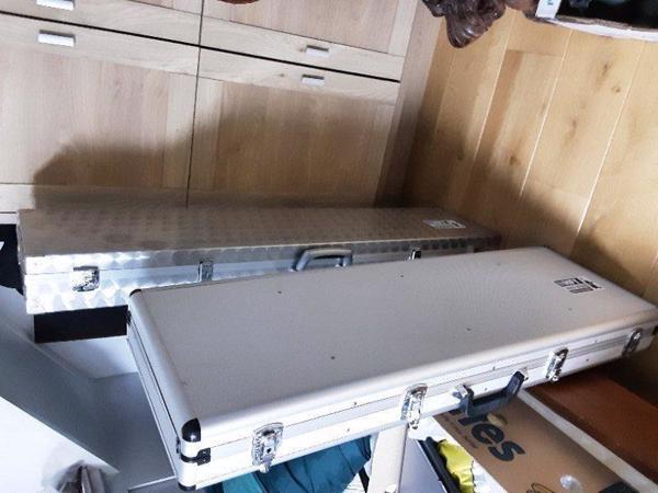 degelijke koffer, alu, met 4 clips. Hangslotje met twee sleutels erbij. Voorste koffer van de eerste foto. Buiten afmeting l 110 x br 35 x d 11.5 cm dik (binnenin 10,5 cm dik . Ik heb onlangs veel meer betaald dan ik nu vraag daarom is mijn prijs vast, bieden heeft geen zin.