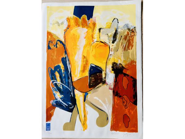 Abstracte warmkleurige prent van Robbert 20/200, 70 bij 50 cm, zonder lijst. Kwalitatief mooi drukwerk, krachtige kleuren. Afmeting met wit 76 bij 56 ( prent 70 bij 50). Nr 20 van 100 . Overwegend prima conditie wel lichte vouw wat zichtbaar aan de bovenkant. Alleen ophalen om het mooi te houden.