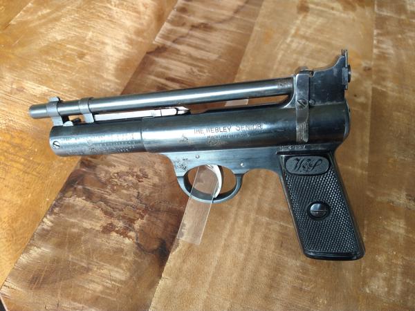 zeldzame Webley Senior, ongeveer 1928... vulcanized rubber grips... is weinig of niet gebruikt (schiet zeer krachtig!) heeft echter lang gelegen waardoor pitting is ontstaan, vandaar de lage prijs, als onderdeel donor of als restaureer project.. greepjes en schroeven zijn perfect...