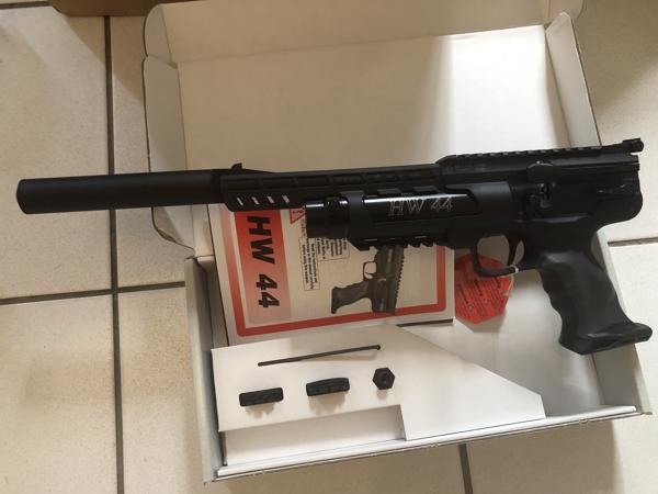 TK: HW44 4.5mm F versie (7.5j) dus lekker veel schoten. Nederlandse versie heb je niks aan met maar 15 schoten. Deze zou er zo'n 100 moeten doen. Incl bijbehorende demper a E65. Incl originele doos etc. Incl enkelschots adapter online gekocht a E15. Misschien 60 schoten gedaan. Ik vind er niet veel aan; heb liever een veerpistool.