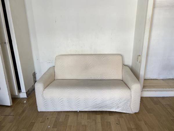 Fijn wit 2 zits bankje van ribstof. Met gebruikerssporen, en daarom wasbare hoes eroverheen. Foto’s met en zonder hoes.
