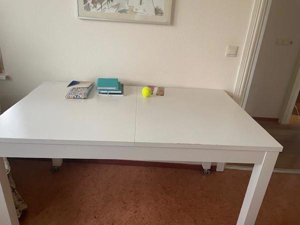 Veel plezier gehad van mijn witte uitschuifbare tafel. LxBxH is 140 bij 84 bij 80cm. Heb er destijds wieltjes onder gezet /met rem Er horen nog 2 losse delen bij waardoor je de tafel kan verlengen tot ong. 2meter. Op de foto is de tafel niet uitgeschoven.