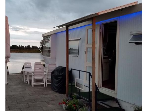pvc afwerking lengte 8 meter breed 3.20 Ruime woon gedeelte met rondzithoek banken kunnen ook als opslag dienen. Tv kast met extra vakken en kasje met deur luidsprekers ruime vensterbanken 1 slaapkamer inclusief kast bed is ook als opslag te gebruiken mooie keuken met 4 onder kasten en 4 boven kasten afzuigkap, koelkast , spoelbak, onderbouw verlichting stopcontacten boven werkblad keuken geiser voor warm water openhaard gas toilet eethoek zonnescherm voorzijde schuur met douche, 2 werkbladen met kastjes schutting