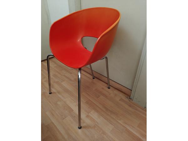 Zes stapelbare stoelen van oranje kunststof op stalen/chroom poten in de stijl van de Sintesi Orbit Large of Butik Orion. Een deel van de rugleuningen is licht verkleurd door zonlicht.