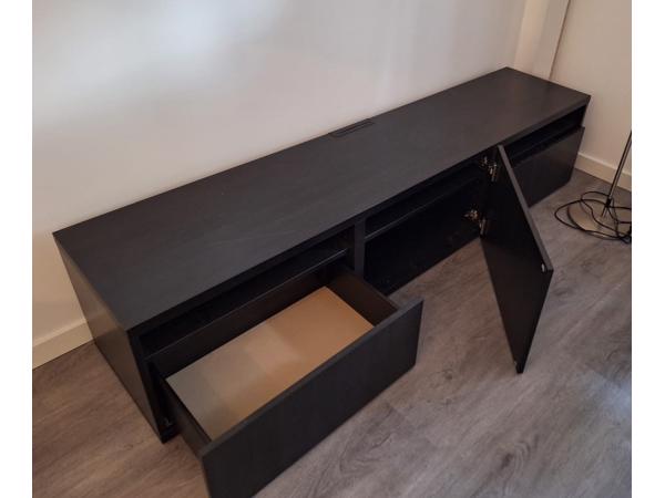 Zwart tv meubel BESTÅ van ikea 180x40x38 cm. Inclusief 2 lades en 1 vak met plank + deur. Ophalen in centrum Pijnacker, begane grond. Ik heb een hondje beschikbaar voor verplaatsen naar de auto. Zelf demonteren indien gewenst. Heeft wat krassen op de bovenkant.